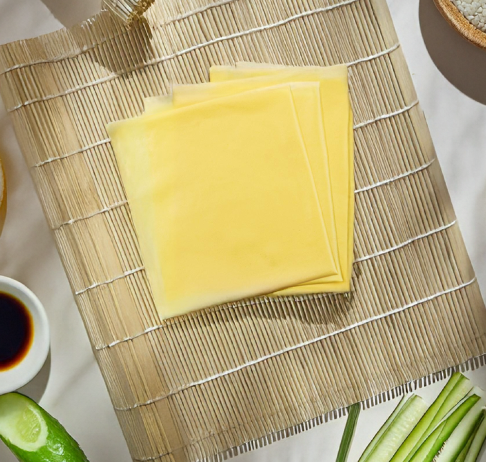 يُستخدم هذا الورق في لف السوشي أو تحضير أطباق متنوعة من السوشي مثل "ماكي" أو "أونيغيري"، ويعطي لمسة فنية وأنيقة للطعام. كما أن لونه الفاتح يمكن أن يضيف تنوعًا بصريًا في الأطباق ويجعلها أكثر جذبًا.